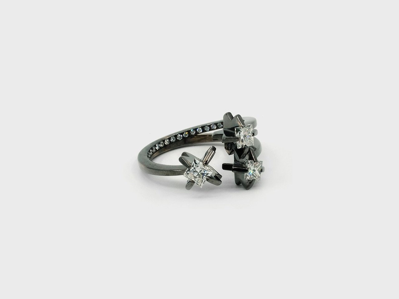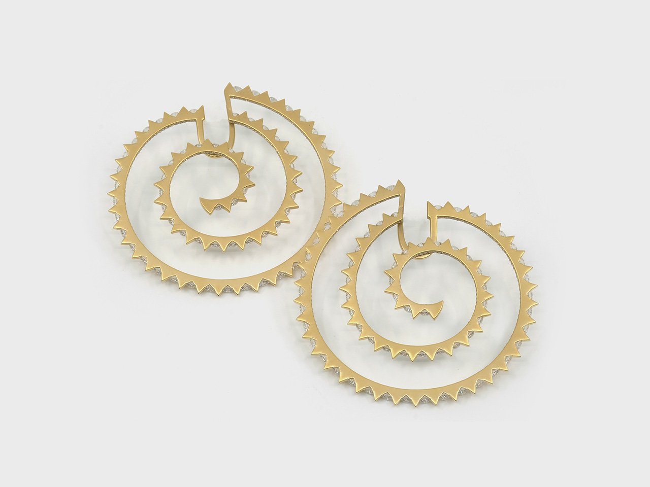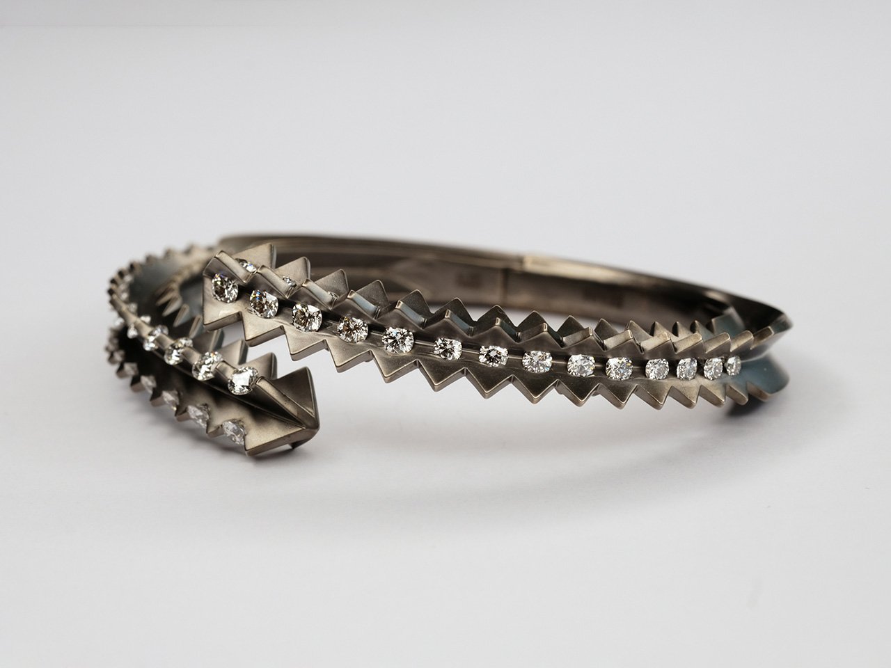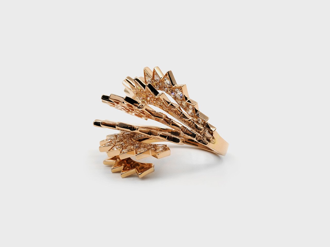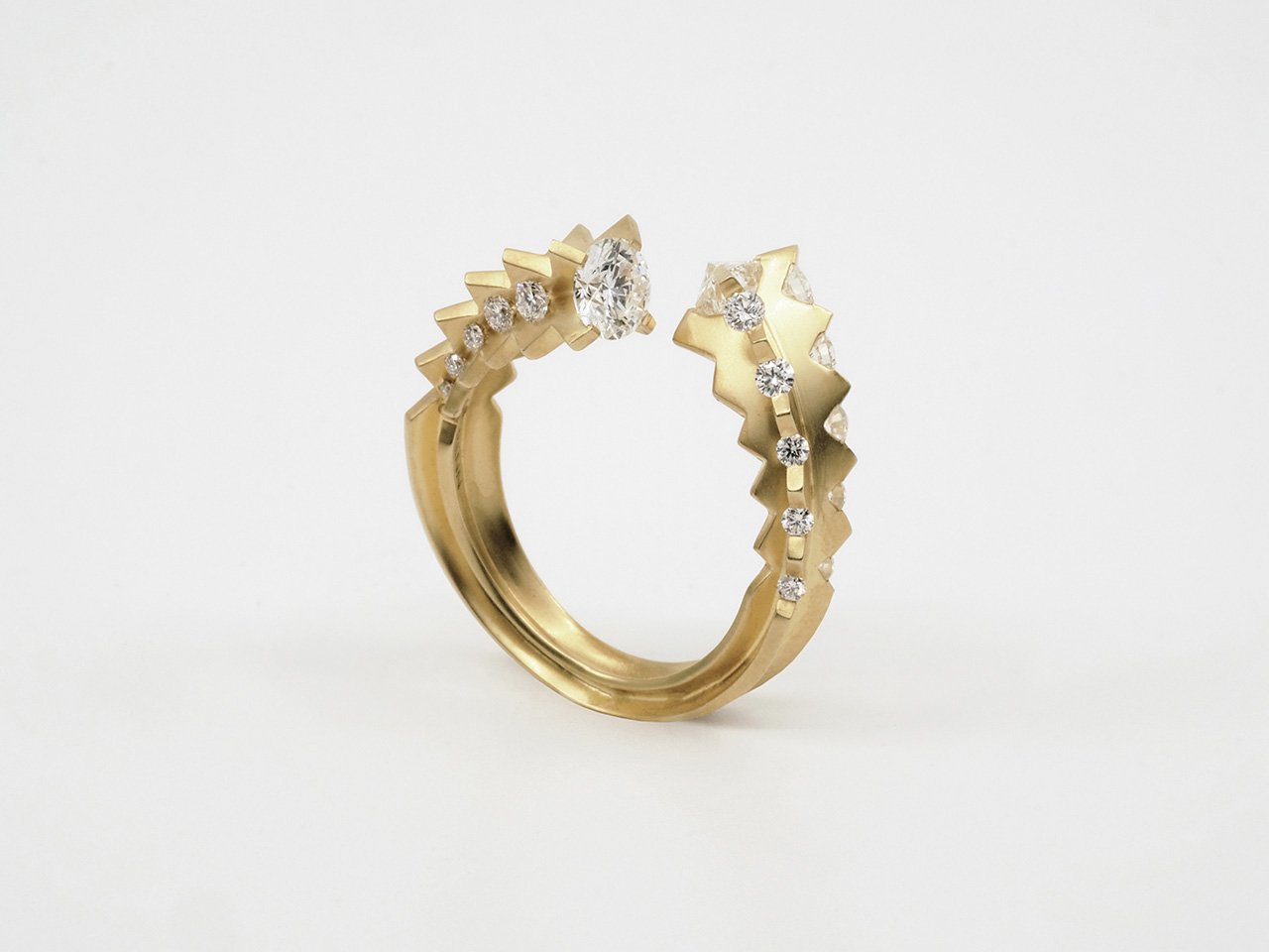 The Cacti is an abstract interpretation that features diamonds precariously set between serrated edges and held inside folds of gold. The exposed fragile corners of the diamonds reinforce the fierceness of the visual language of the works. The subverted gold in matte contrasts the diamonds while the high-gloss gold amplifies the diamonds in the collection.