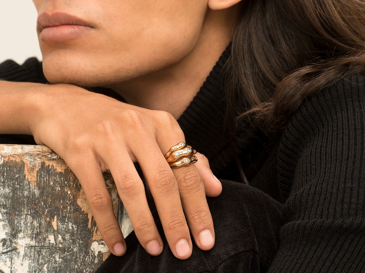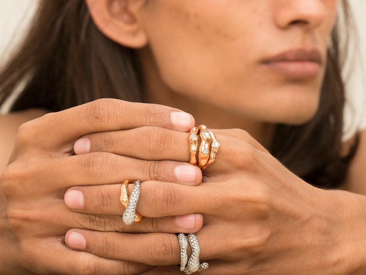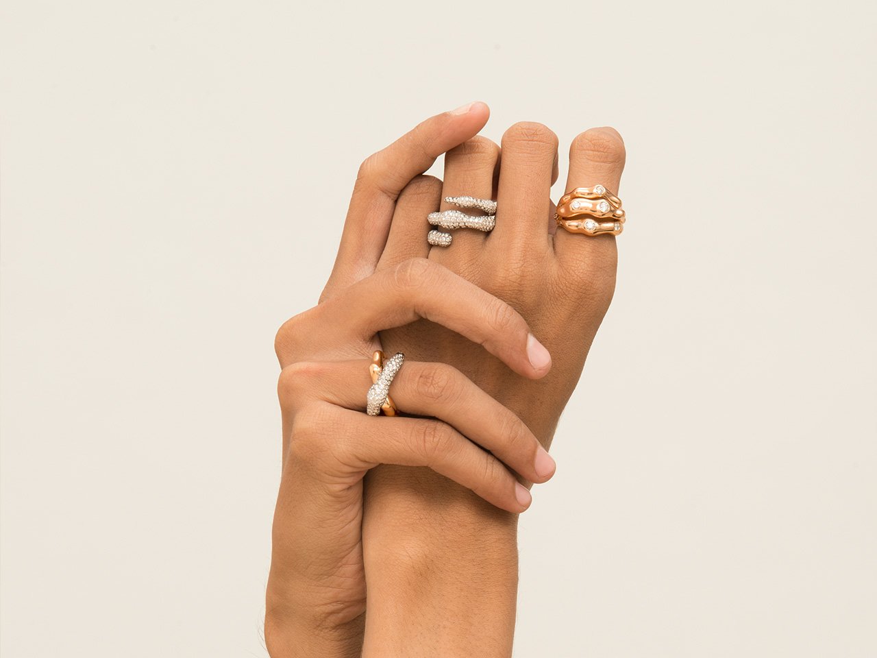 The organic forms of the ring in high gloss rose gold are sprinkled with diamonds and entwine the finger.