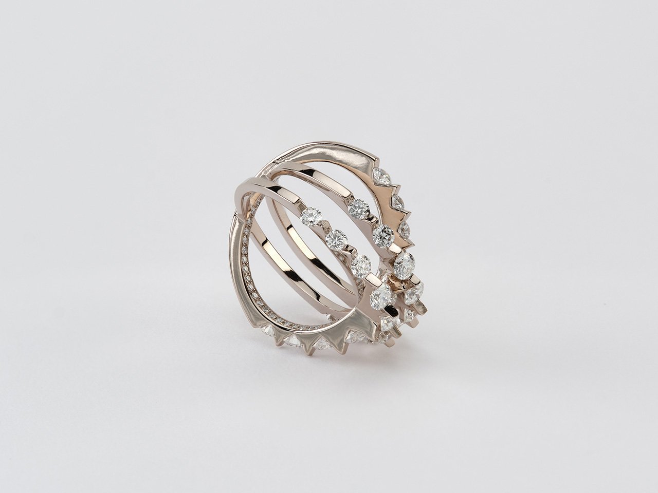 This abstract interpretation of the Cacti cross ring features diamonds precariously set between serrated edges of gold.