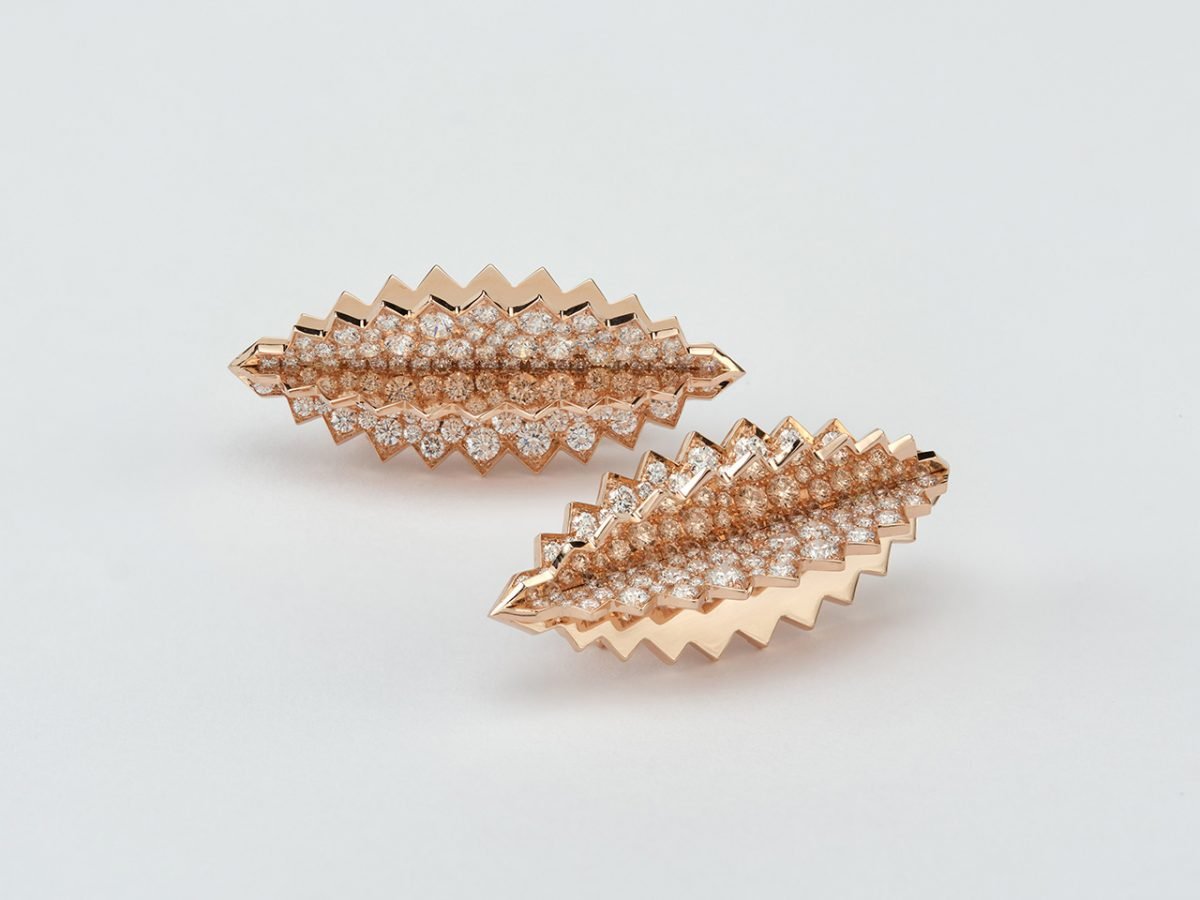 The bypass bracelet in 18k rose gold is set with a pave of diamonds