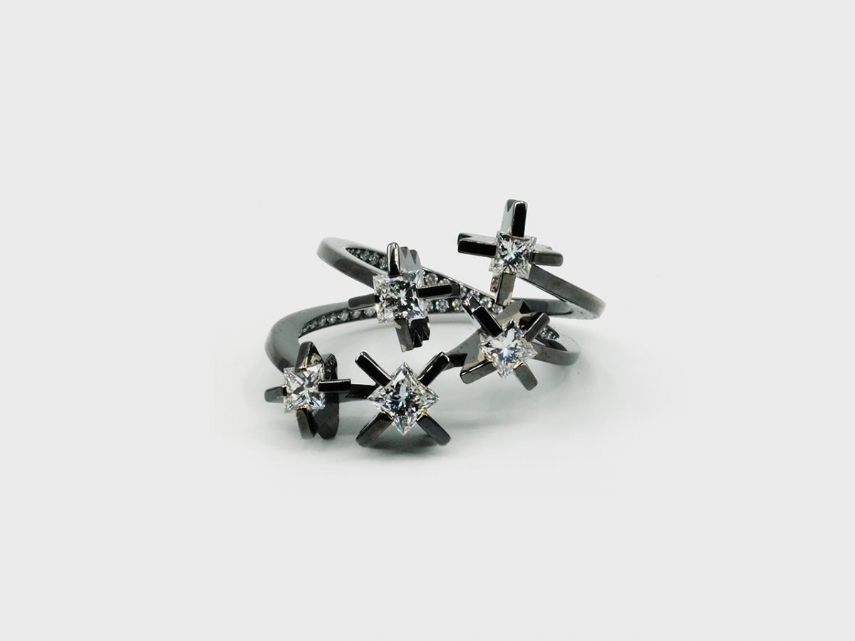 The tennis bracelet in 18k blackened white gold is set with princess-cut diamonds