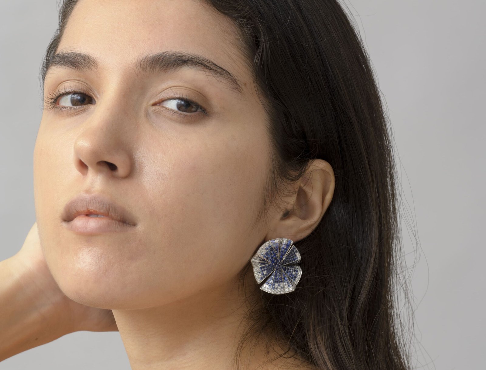 The circular front-back earrings in 18k white gold are set with an ombre of Burmese sapphires and diamonds.