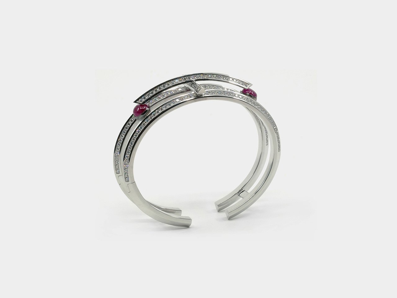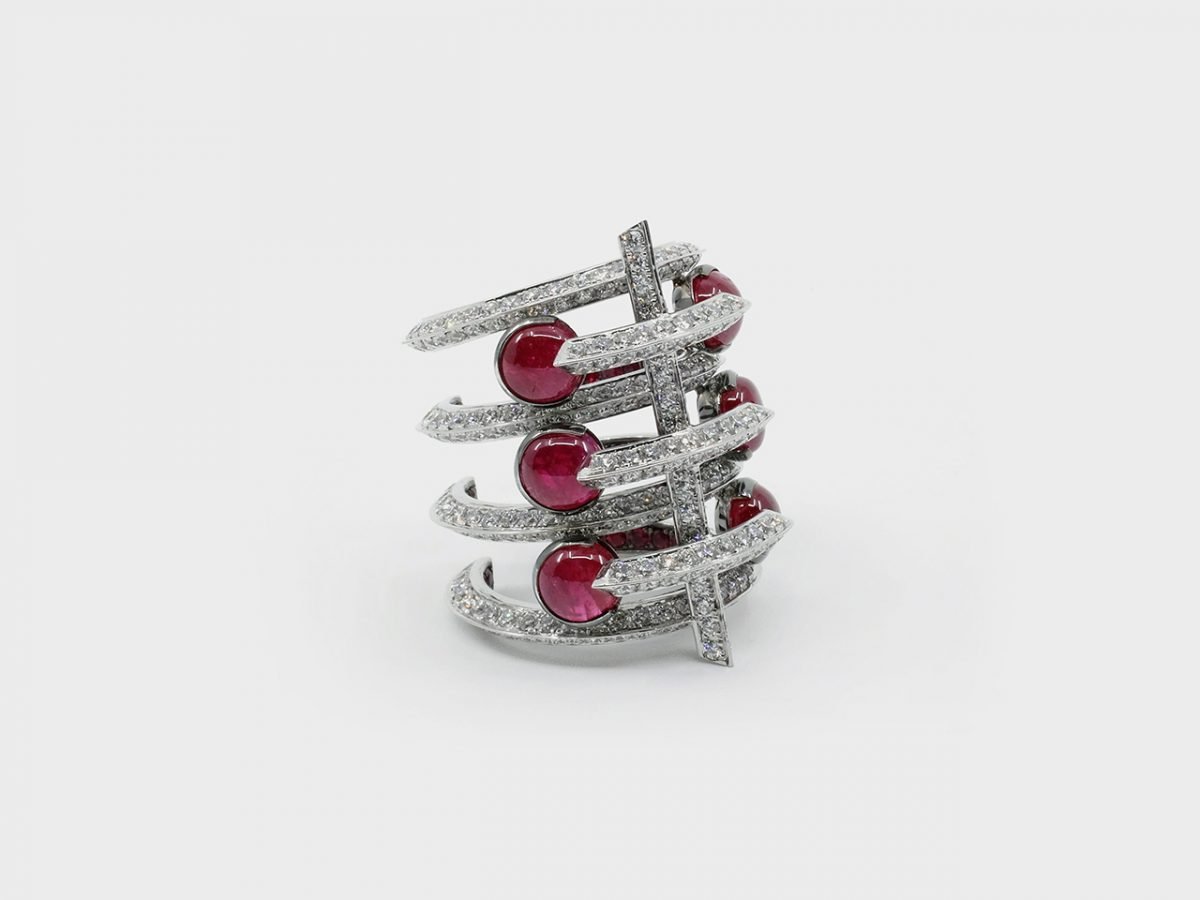 The Fish ruby open cuff bracelet delves into the significance of simple things by abstracting forms in nature. The design is translated into a visual language of a line folded to create ribs and spines through a distinct pattern.