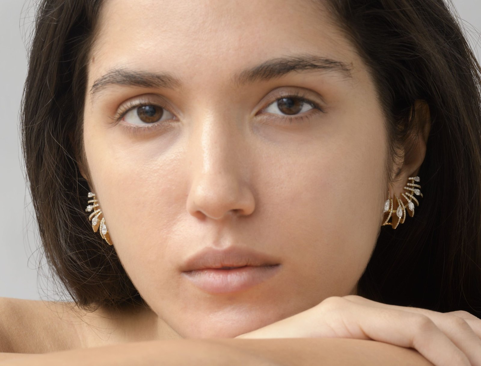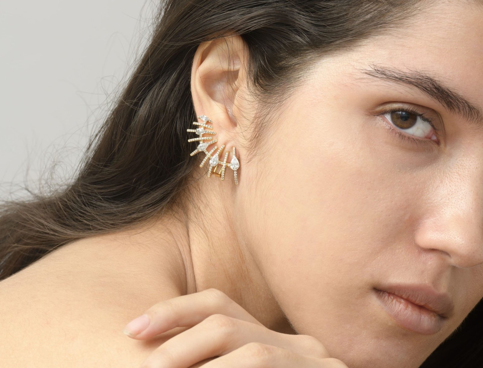 Diamonds are delicately held on these planes, and volume is created by reflective surfaces amplifying the gold.