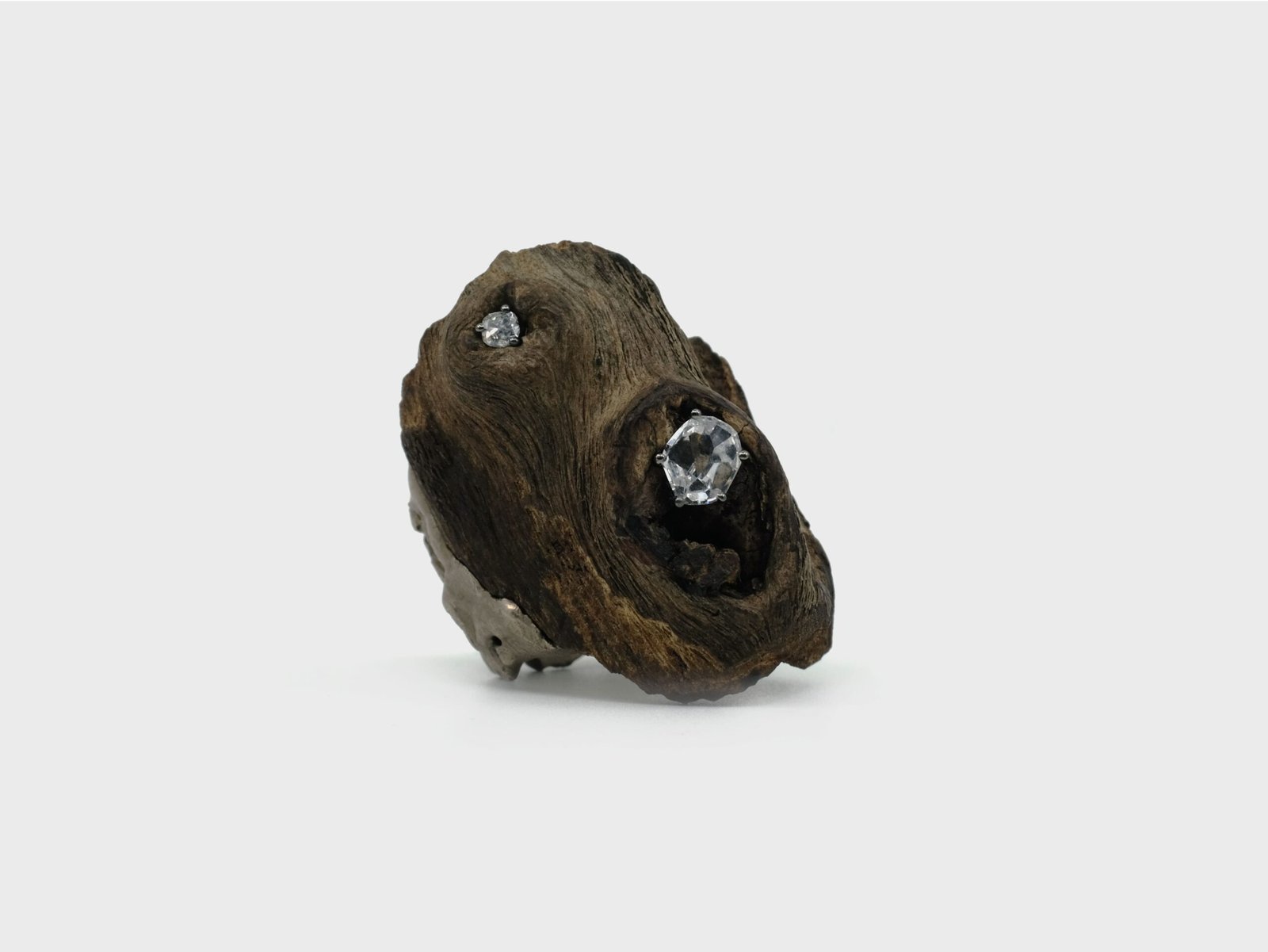 Made in 18k grey gold and found wood, the ring is set with free-form diamonds