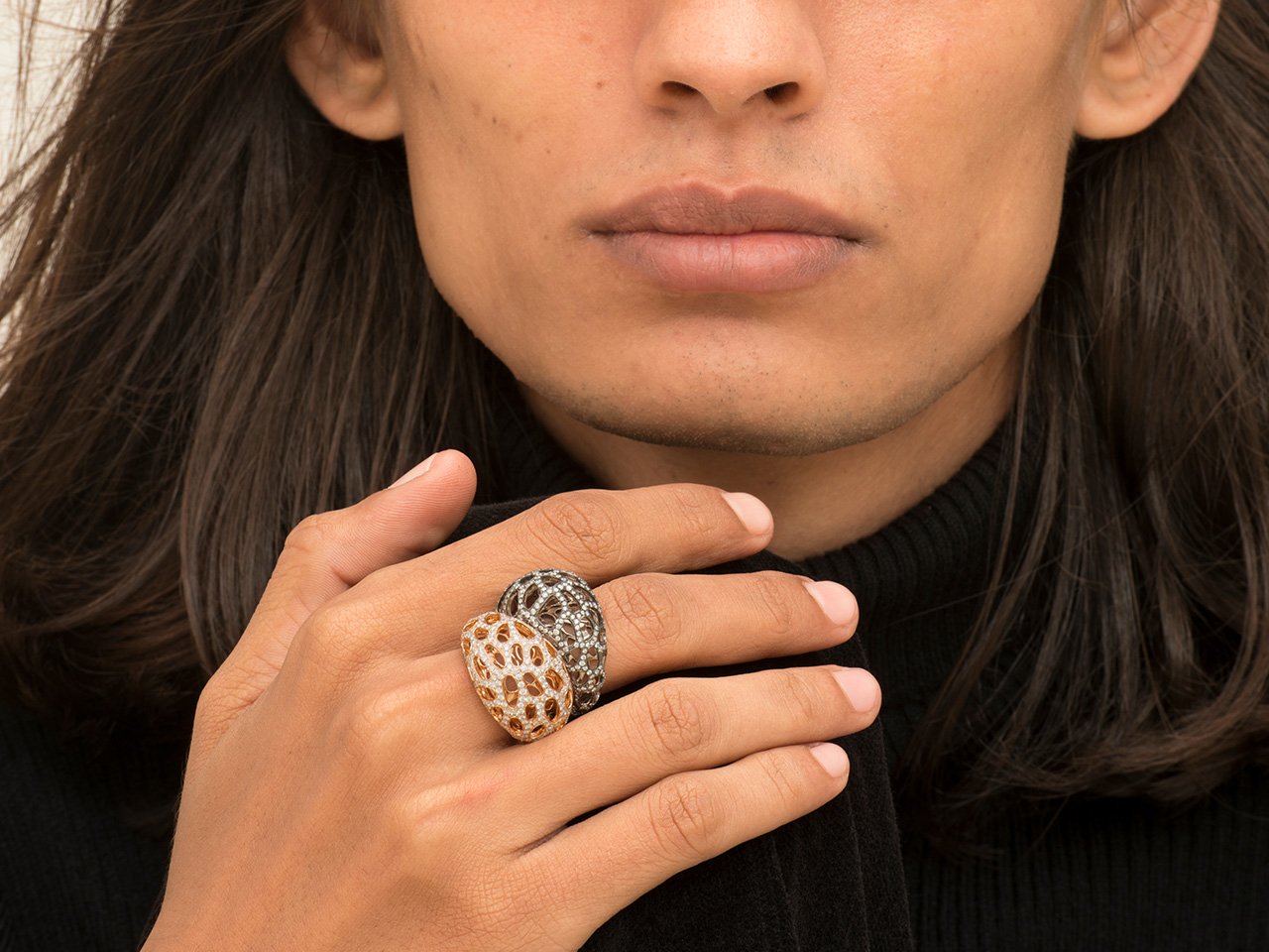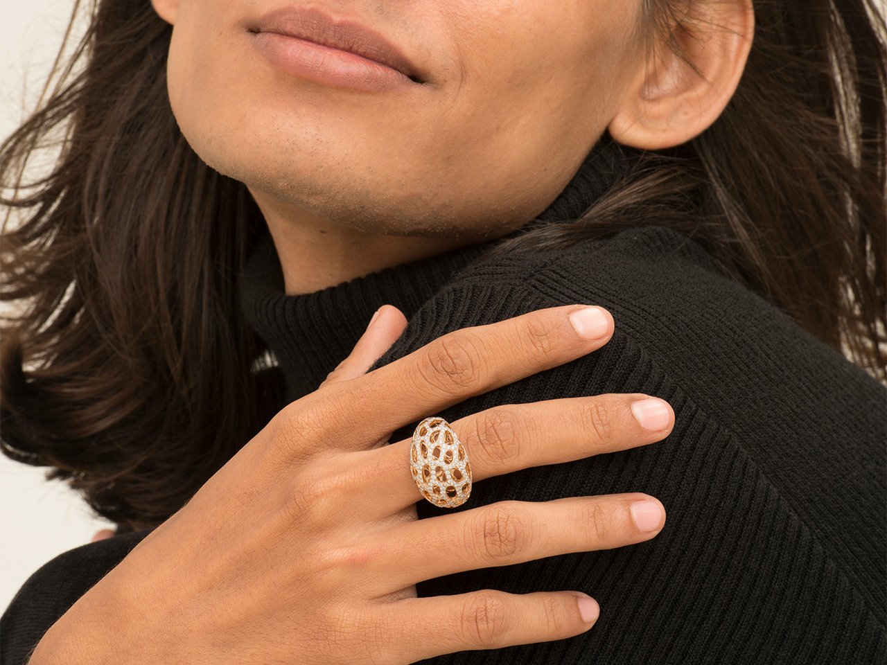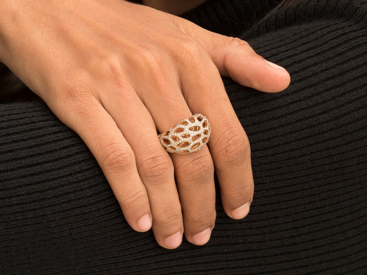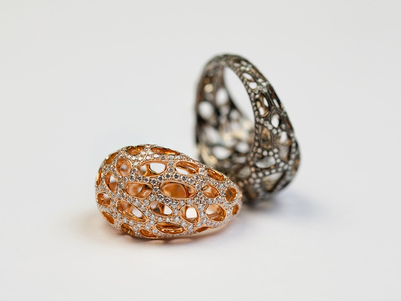 A stylized interpretation of a triad of rings, the rose gold ring evokes a life form in full bloom.