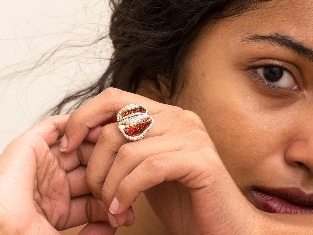 The design is an expression of the intangible over the tangible. It explores the evolution of reflections. The gold outshines the diamonds; and hidden rubies are revealed through the changing reflections on the high gloss mirror-finish gold surface.