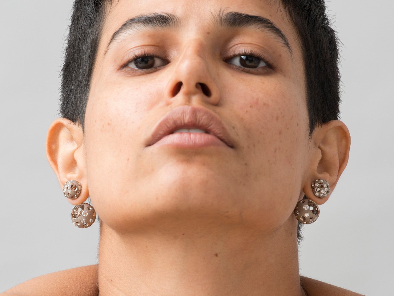 The Puffball Voids drop earrings explore the unsettling nature of incompleteness – a technical in-house innovation wherein the casting skin on gold is left unpolished, contrasting against the polished rims of the voids and the diamonds.