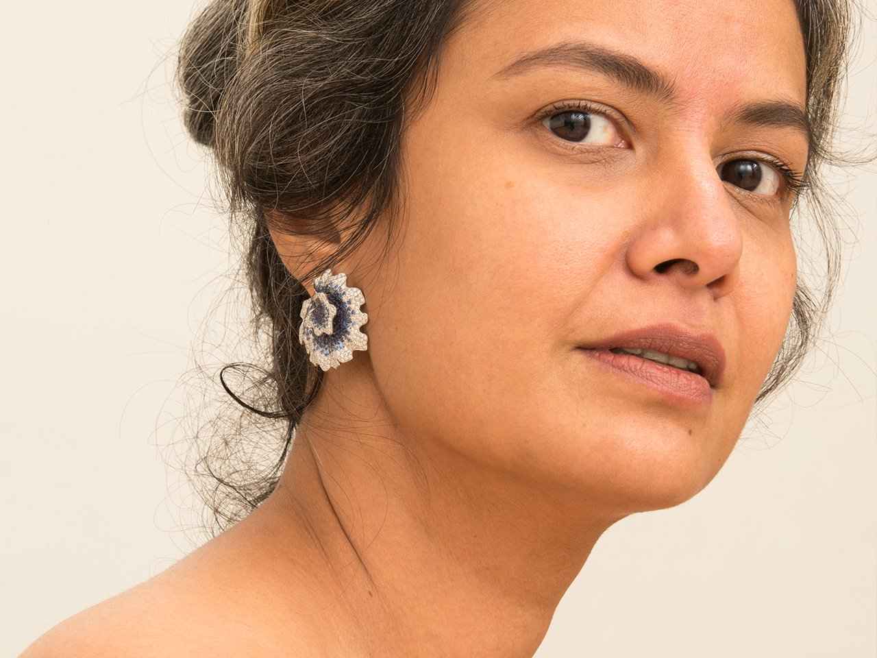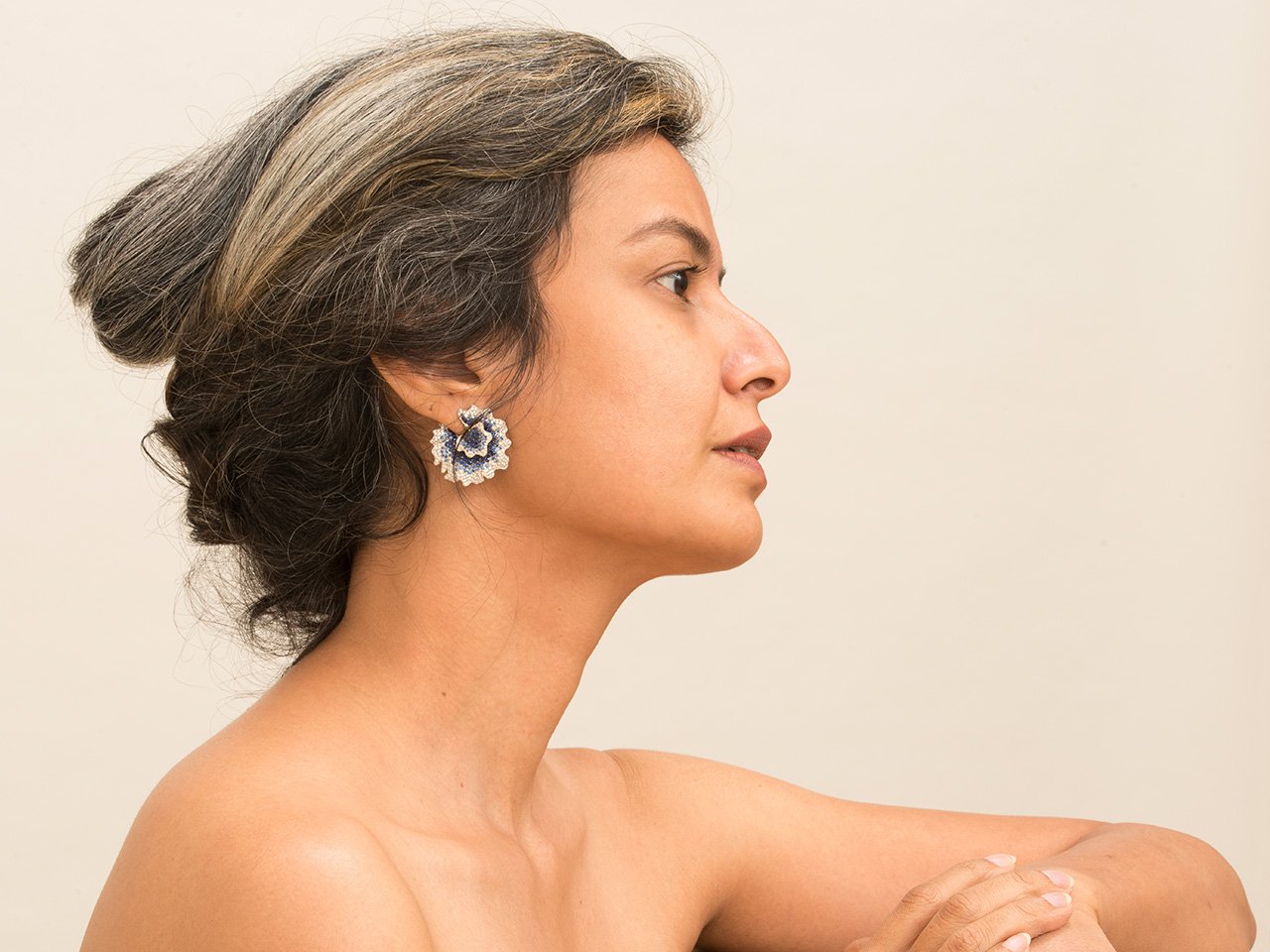 The ombré of gems, on overlapping brackets, appear to fold from the front and continue behind the earlobe.