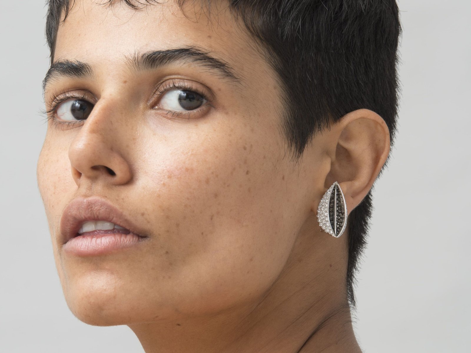 The Seed-Leaf eartops represent the cyclicity of all things and explores ideas of fertility, abundance, creation. The white gold in high-gloss finish reflects the diamonds.