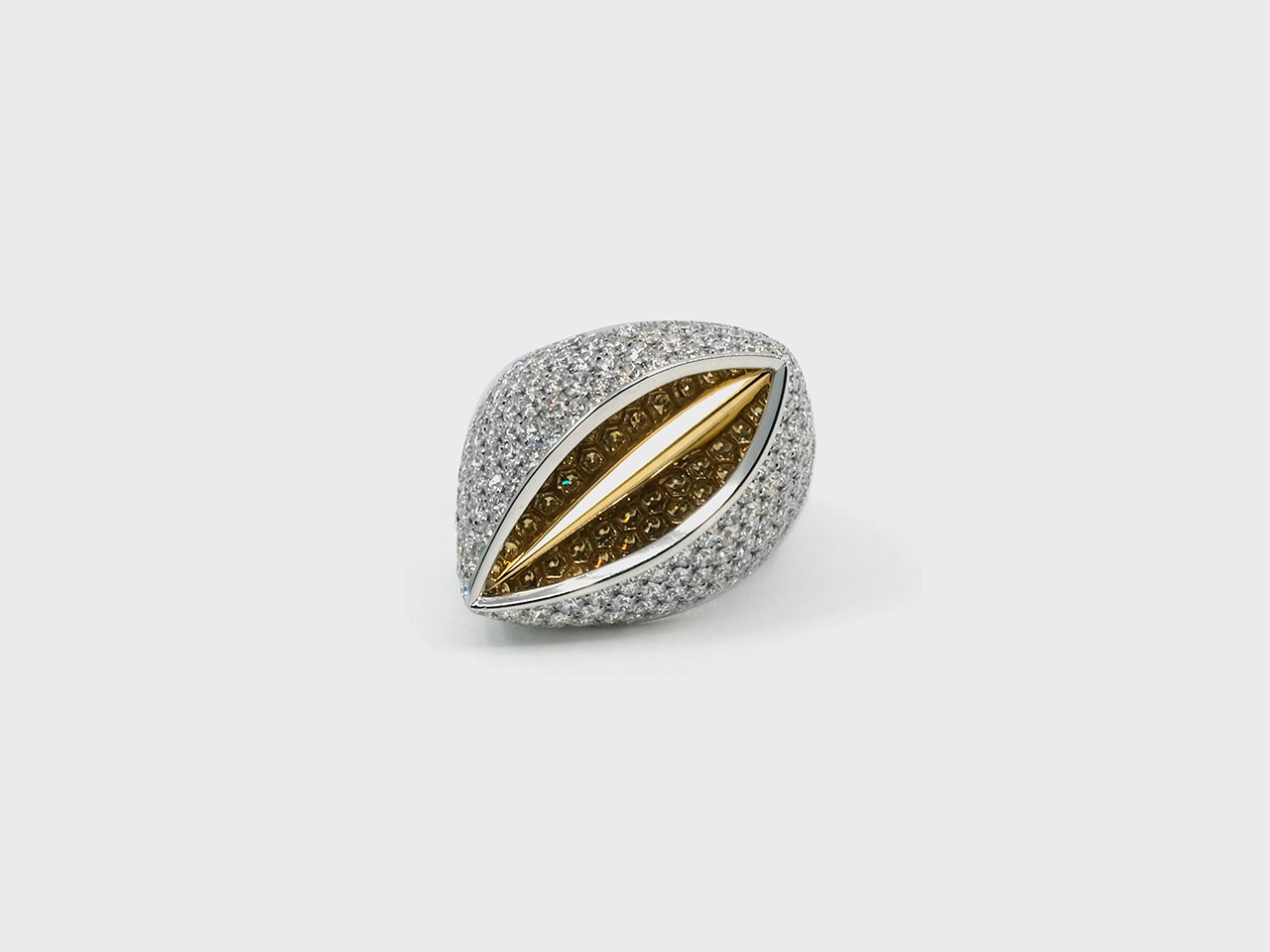 The ring in 18k white and yellow gold is set with a pave of diamonds