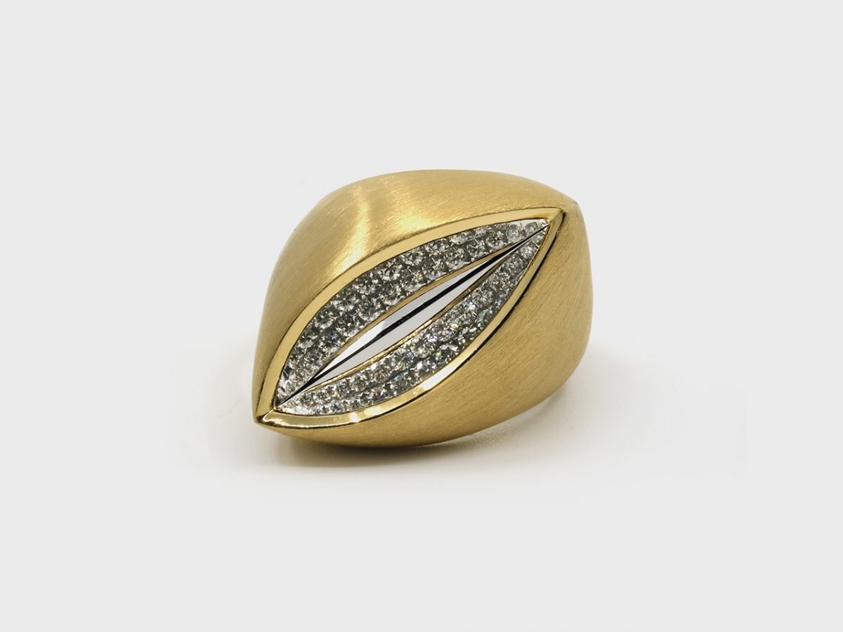 The Seed-Leaf mini ear tops represents the cyclicity of all things and explores ideas of fertility, abundance, creation. The white and yellow gold in gloss contrasts with the round diamonds.