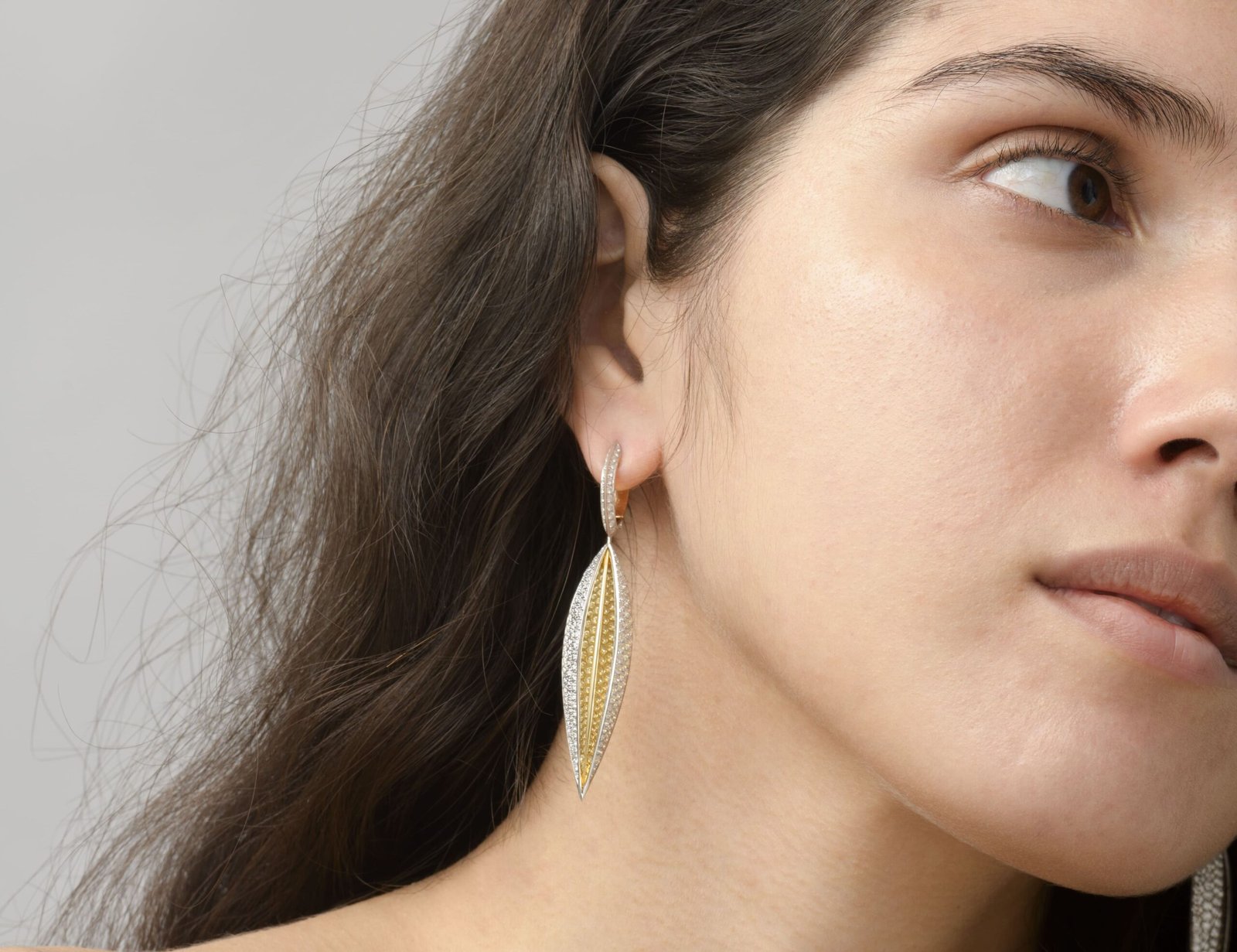 The Seed-Leaf Spear Earrings represents the cyclicity of all things and explores ideas of fertility, abundance, creation. The yellow gold in high-gloss reflects the diamonds.