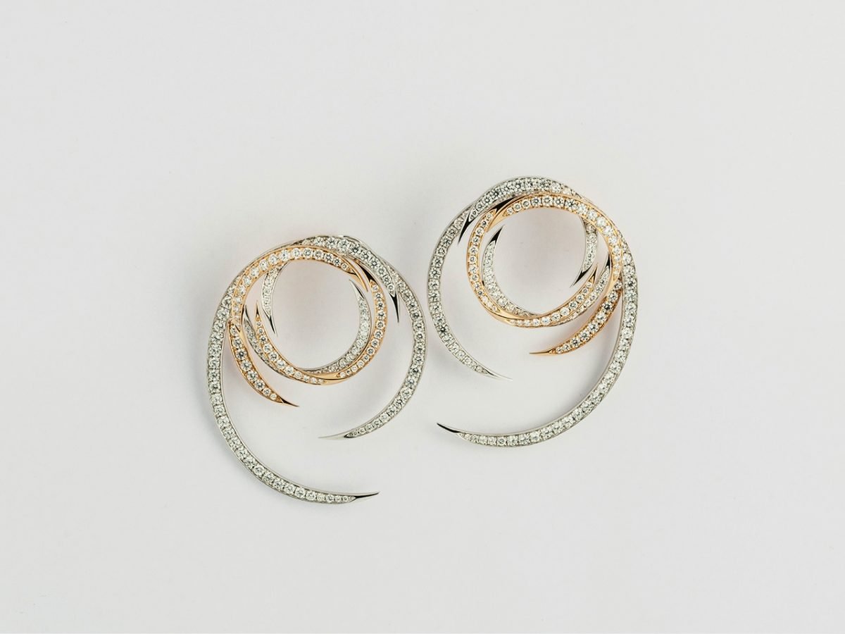 The design explores overlapping curves that merge into one, and defies convention as curves of gold with diamonds end in sharp points.