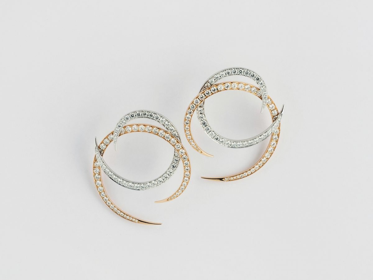 The earrings in 18k white and rose gold are set with diamonds. The earrings can be worn two ways – with or without the attachment.